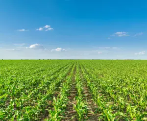 Growing corn field, green agricultural landscape